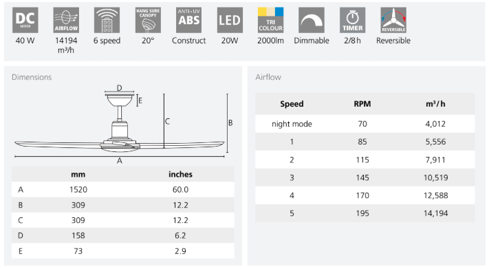 EGLO SURF Ceiling Fan With Light Is Built To Be Waves Above The Rest - Featuring Powerful Airflow, Non-Rust ABS Blades & Housing, And A 6-Speed Remote Control (Including Night Mode) With LED Tri Colour LED 20W Light.